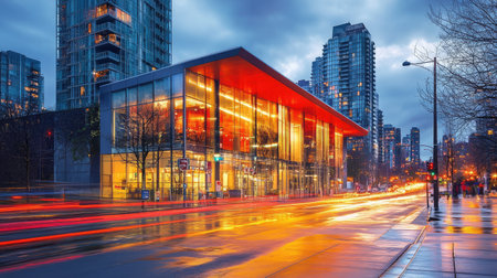 A captivating urban scene at dusk showcasing modern architecture with a glowing facade, vibrant street life, and dynamic traffic motion in a lively city atmosphere.