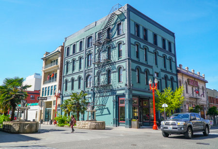 VICTORIA, CANADA - JULY 13, 2019: street view and buildings in the city center of Victoria historical and travel destination