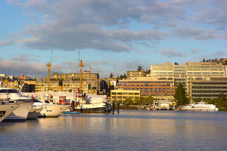 Sunrise over Lake Union in Seattle, Washington, USA. Lake Union panorama with boats and seaplane docks.