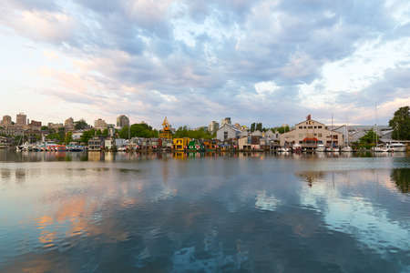 City landscape with buildings, yachts, and floating houses along the shore. Sunrise at False Creek waterfront, Vancouver, British Columbia, Canada.