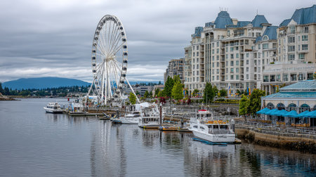 Modern yachts in inner Harbor Afternoon, Victoria, BC. Victoria's Inner Harbor and marina in downtown Victoria. Street view, travel photo, selective focus, nobody, copy space for text