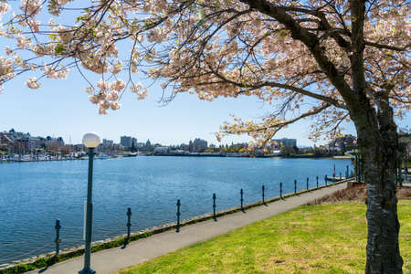 Songhees Point Park Walkway. Full bloom cherry blossom during springtime. Victoria Inner Harbour. Victoria, BC, Canada.