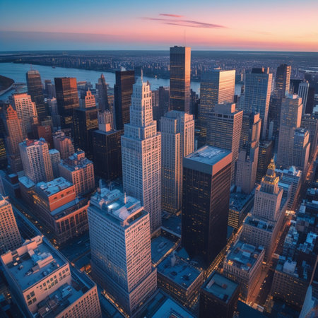 Majestic skyscrapers rise against a twilight background, illuminating the financial district. Streets buzz with activity as the city transforms into a dazzling spectacle of lights and life.
