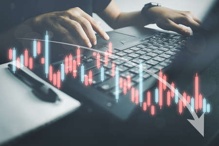 Investor analyze stock chart with laptop, businessman forecast and analysis graph in Bearish downtrend, economic slowdown, inflation crisis, loan interest rise, trade war finance, covid-19 impact.