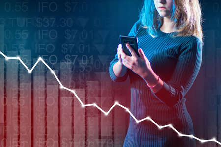 Fin tech app for smartphone. Falling chart next to investor. Woman investor uses fin tech. Data analytics in fin tech concept. Financial technology in a smartphone application. Investment application