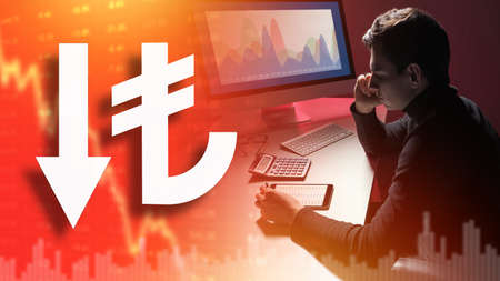Turkey lira is falling. Fall of graph as metaphor for crisis. Turkey stock market situation. Exchange economy of Turkish Republic. Turkish currency crisis lira. Turkish trader in office