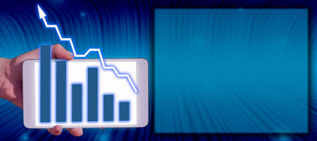 A red downward trending arrow overlays a blue bar graph, illustrating a significant financial or economic downturn.