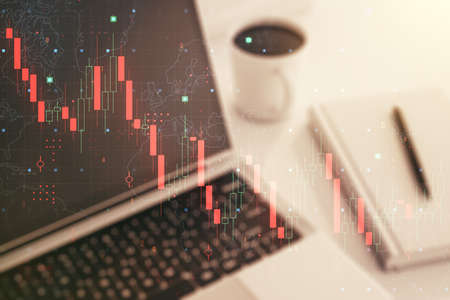 Creative concept of crisis chart illustration on modern laptop background. Global crisis and bankruptcy concept. Multiexposure