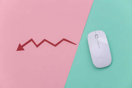 White mouse with a falling arrow on pink blue background. Online business, trading, crisis. top view