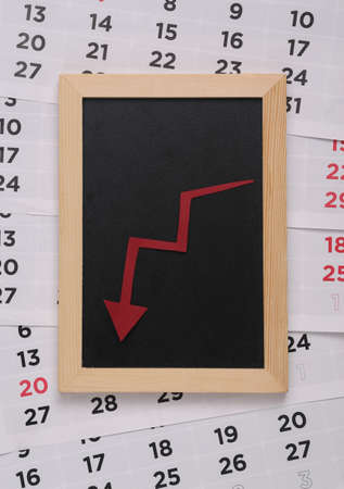 Mini chalk board with a growth arrow and calendar on blue background. business concept