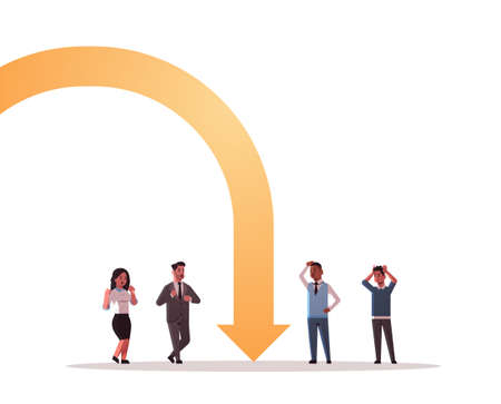 businesspeople frustrated about economic arrow falling down financial crisis bankrupt investment risk concept mix race stressed employees standing together full length vector illustration