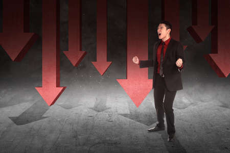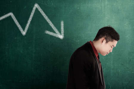 sad asian businessman falling down over business graph background