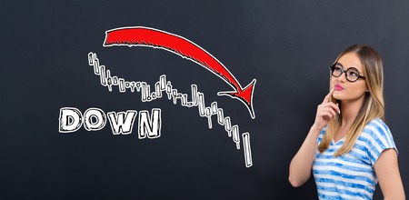 Market down trend chart with young woman in front of a blackboard