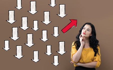 Arrow going in a different direction with young businesswoman on a brown background