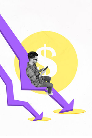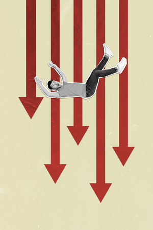 Employees suffering from crisis, unemployment and bankruptcy. Money symbols with downward arrows signifying loss. Contemporary art collage
