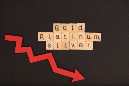 Word gold, silver, platinum assembled from wooden letters game and reg arrow on black school chalkboard. concept of falling prices for precious metals