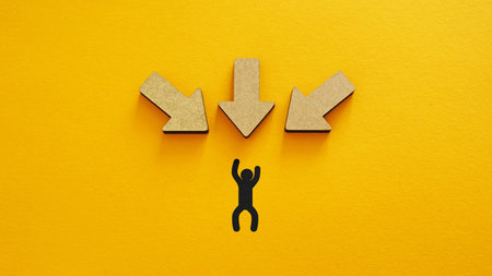 Stress and pressure concept - wooden arrows pointing down at small human figure symbolizing pressure, stress, or overwhelming challenges on bright yellow background