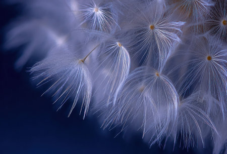 Macro view of a fluffy seedhead with delicate, translucent, and feathery wisps, bathed in blue
