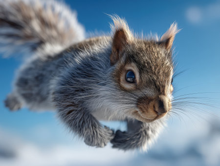 A squirrel in mid-air with a focused expression and vivid details of fur on a clear day. Its limbs are tucked, giving an impression of dynamic movement against the sky
