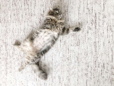 Cute gray fluffy cat by the window. Pets, purebred cats, nature protection. Blurred background outside the window
