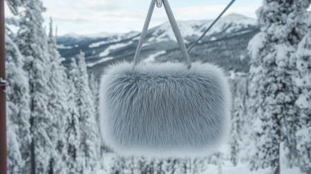 A soft gray fur accessory hung against a stunning winter mountain scenery, showcasing the beauty of nature in a tranquil and stylish way. Perfect for fashion enthusiasts.