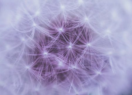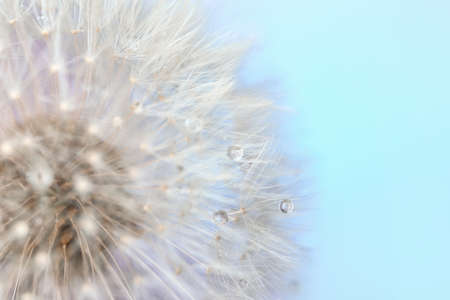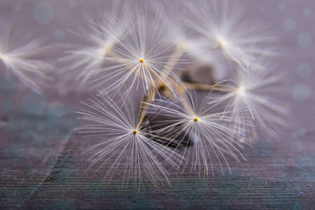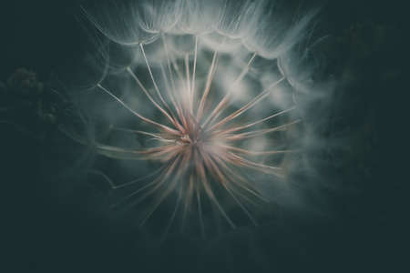 Dandelion fluffy seeds in openwork pattern on abstract background. Dreamy thoughts.