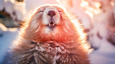 A cute, fluffy marmot on a sunny day crawled out of its hole among the white snow on a sunny day, in a pink light. The traditional holiday is Groundhog Day in the USA and Canada, on which he will see his shadow, early spring or long winter.