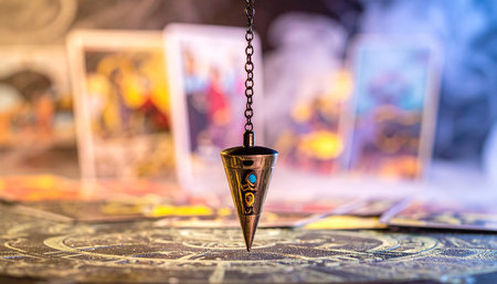 A pendulum hangs in front of blurred tarot cards with mystical smoke and glowing bokeh lights creating an ethereal atmosphere.