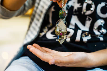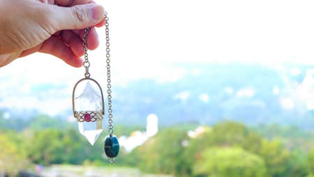 Foretelling the future with crystal pendulum. holding and using quartz crystal pendulum and using it, nature background.