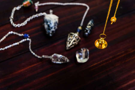 Mystical pendulum on a chain swings over a magic table. gold tones