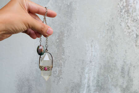 holding and using quartz crystal pendulum and using it In asking questions. pendulum quartz on stone background.