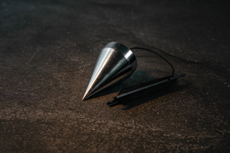 Brass pendulum held for energetic dowsing, used to sense subtle vibrations and read energy in holistic therapy, meditation, and alternative healing. Shows focus, balance, and spiritual intention.
