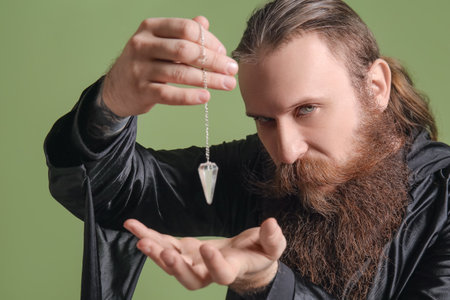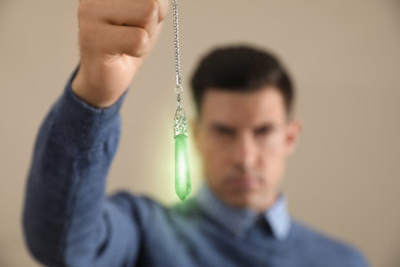 Psychotherapist with pendulum on beige background. Hypnotherapy sessions