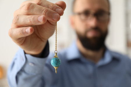 Psychotherapist with pendulum in office. Hypnotherapy sessions
