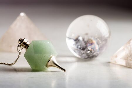 crystal ball, rock crystal pyramid and Pendulum, Reiki concept