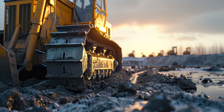 Heavy-Duty Yellow Bulldozers on Construction Site at Dramatic Sunset, Ready for Work