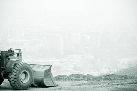 Early winter. Bulldozer rakes a pile of mountain soil in a mountainous area