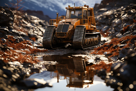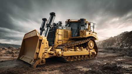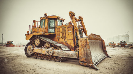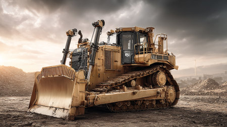 Majestic bulldozer resting powerfully on a vast, sunlit construction site landscape