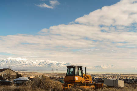 Empty yellow loader on a hill with view of the lake and snow topped mountain. Houses on a residential area in the valley can also be seen under the cloudy sky.