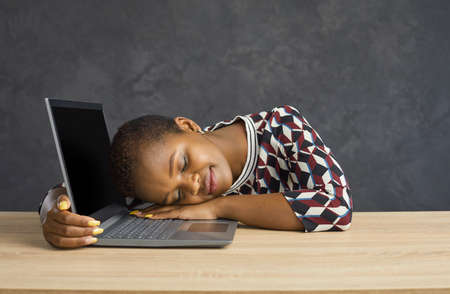 Tired millennial gen z African American girl sit at desk fall asleep on laptop prepare for exam or test. Exhausted young biracial woman sleep nap on computer overwhelmed with work. Overwork concept.