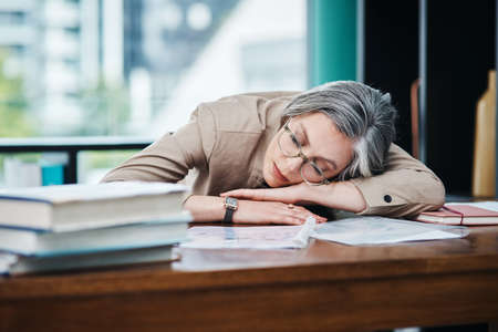 Middle aged business woman taking a nap right at the workplace. Overworked female office worker
