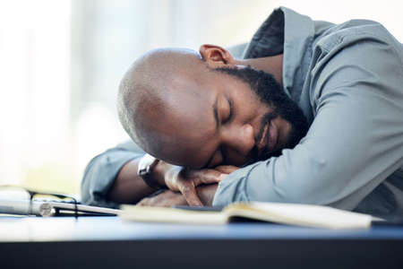 Weary male office employee taking a nap on the workplace. Overworked businessman feeling lack of sleep as a result of excessive exertion. Tired guy feels burnout concept