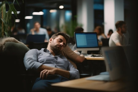 Exhausted employee sleeping on desk with head on arms, overwhelmed by stress and fatigue in modern office after working on laptop, highlighting need for better time management