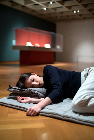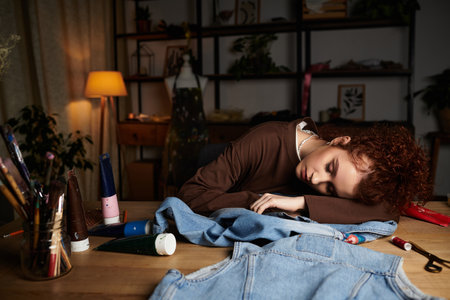 A young woman relaxes on her crafting table, surrounded by DIY materials at dusk.
