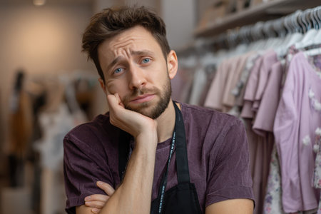 Emotional salesman in a clothing store reflecting on customer interactions and sales strategies during a quiet afternoon in a retail environment