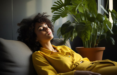 A serene moment of a woman in a stylish yellow outfit, resting in a cozy chair. The soft lighting enhances the calm atmosphere, ideal for relaxation.