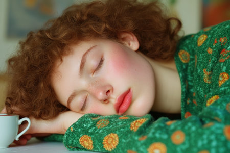 Peaceful Resting Woman with Curly Hair in a Green Floral Sweater.