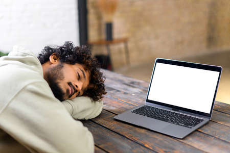 Tired entrepreneur takes a nap on laptop at his home office setup, falling asleep while he works on business management. Man working under pressure and feeling overworked.