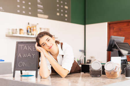 Beautiful caucasian barista woman happy with placing elbows on table of coffee bar near takeaway sign and coffee bottles. Barista work at coffee bar and food service business