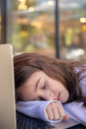 Young businesswoman take a rest in the cafe and sleeping with laptop on the table